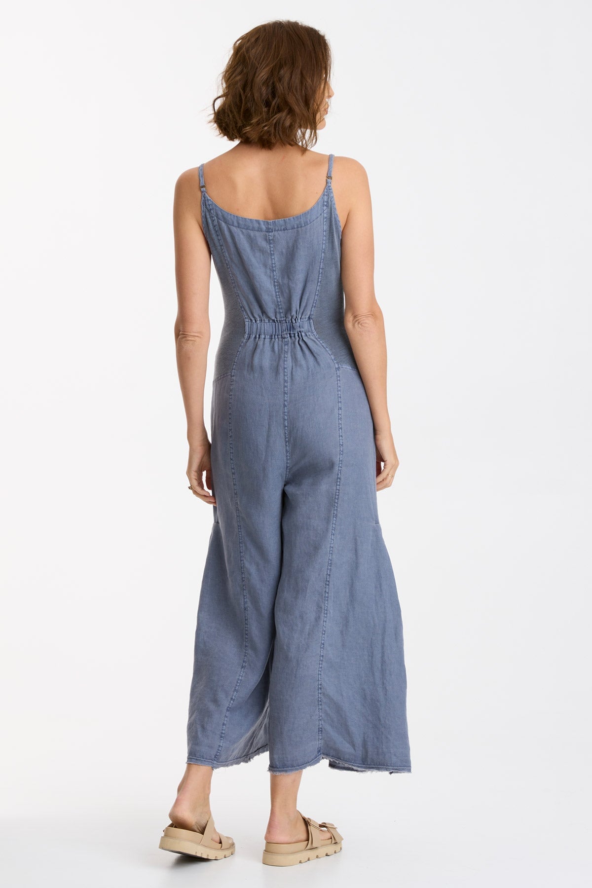A wide-leg silhouette with double box pleats graces this cropped jumpsuit, complete with adjustable straps, antique brass ring snaps in front, an elastic band at the center back and jersey contrast for a contoured fit. Plus a raw-edge hem and twill tape-edged pockets, Calistina has all the bells and whistles needed to impress without the stress!