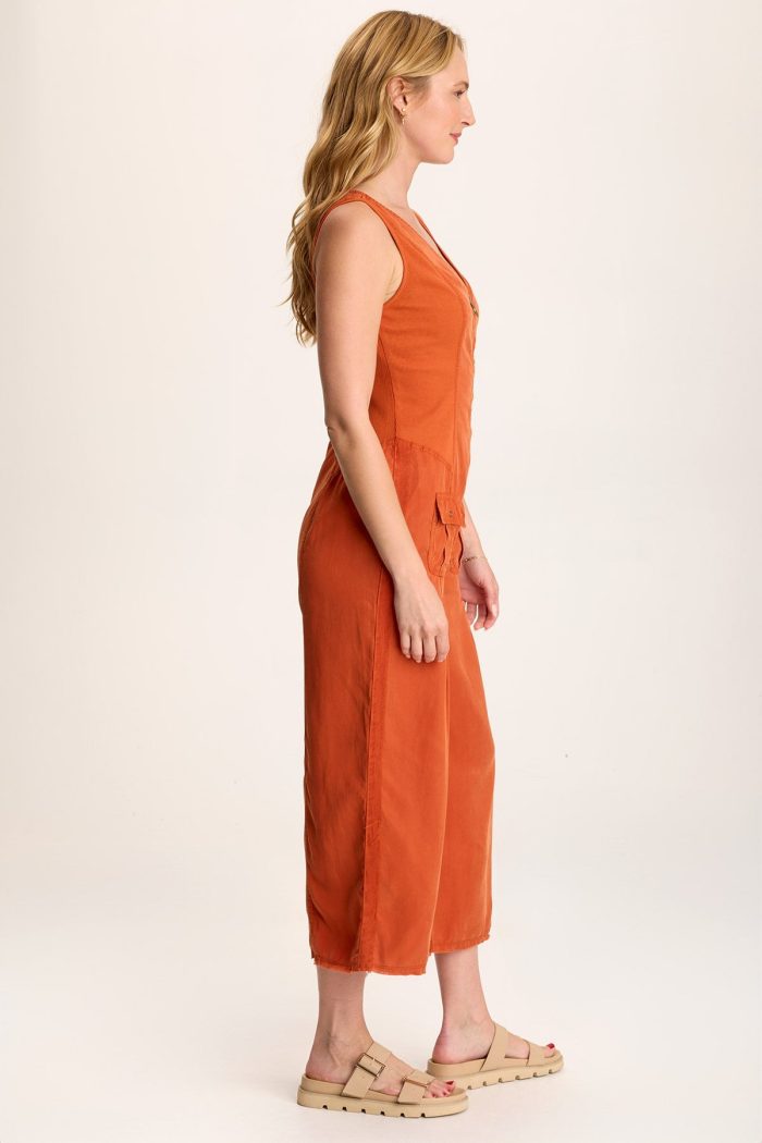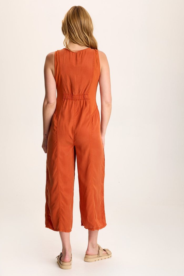 Bra-friendly tank top straps melt into a v-neck cut with an o-ring antique brass zipper closure. Rib inserts keep the silhouette contoured and flexilble, while flap pockets lead into a pleated cropped wide-leg. In soft tencel twill, this is a jumpsuit you won’t want to miss!