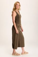 Bra-friendly tank top straps melt into a v-neck cut with an o-ring antique brass zipper closure. Rib inserts keep the silhouette contoured and flexilble, while flap pockets lead into a pleated cropped wide-leg. In soft tencel twill, this is a jumpsuit you won’t want to miss!