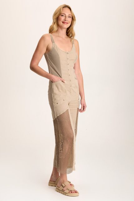 Tank top straps, a flattering scooped neckline, brass ring snap-up closure, pockets at the hips, and cotton crochet paneling at